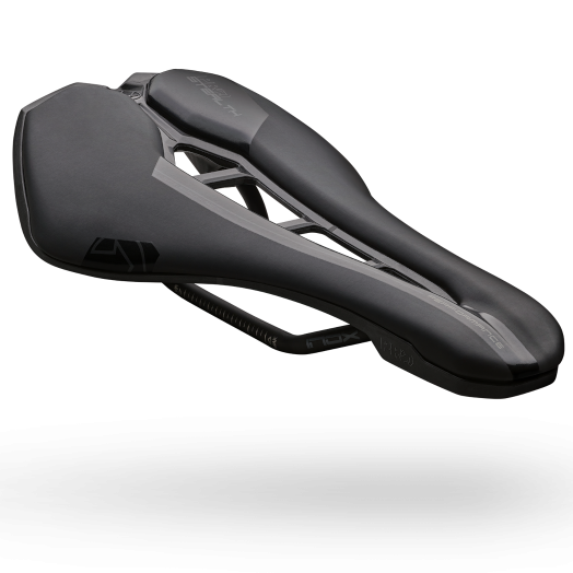 Designed to provide you with a better sports’ bicycle experience the PRO Stealth Performance Saddle is intended for competitive road cyclists who maintain an aggressive, aerodynamic, position on the bike. A carbon reinforced polymer base, set upon stainless-steel rails and covered by lightweight EVA padding, topped by a smooth PU cover produces a stiff performance saddle; available in 142- and 152-millimetre-wide versions. Its wide, stub, nose and a broad anatomic fit recess, with its iconic triple bridge design, ensure that flexible riders can tilt from the pelvis into a deep, pursuit style, position. While ensuring that they do not experience discomfort from any impingements on blood vessels or nerves running though the perineal region.