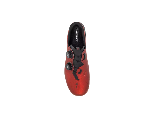 Leveraging data science, we refined every detail of the S-Works Torch’s upper for improved fit and performance. The BOA® cable is shifted down and angled, preventing lift on the ball of the foot and delivering power-enhancing structure while eliminating unwanted pressure or pinching. Adaptive materials allow natural movement of the foot where needed for comfort, while data-driven zonal reinforcement keeps the foot secured for crisp power delivery and optimal efficiency.