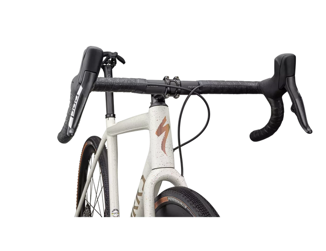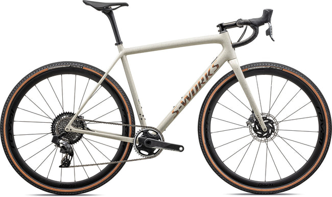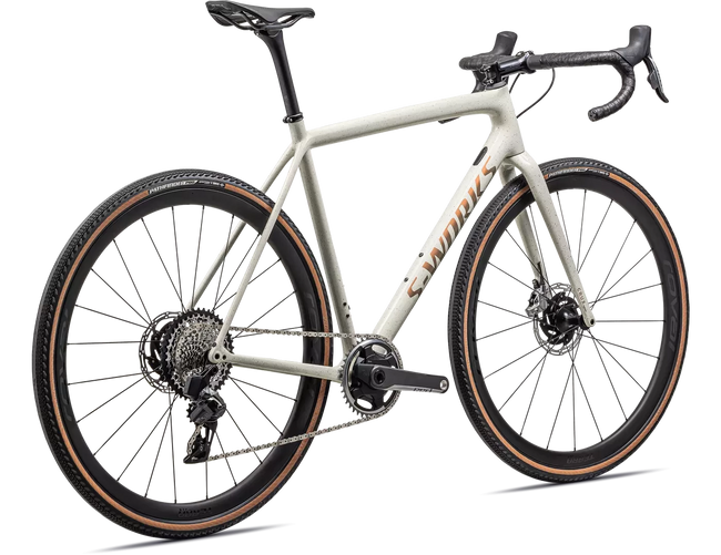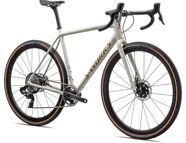 This S-Works Crux comes spec'd with SRAM's pinnacle RED eTap AXS hydraulic disc groupset, lightweight and durable Roval Terra CLX Disc wheels, and 2Bliss Ready, 700x38mm Pathfinder Pro tires that hookup over nasty terrain.