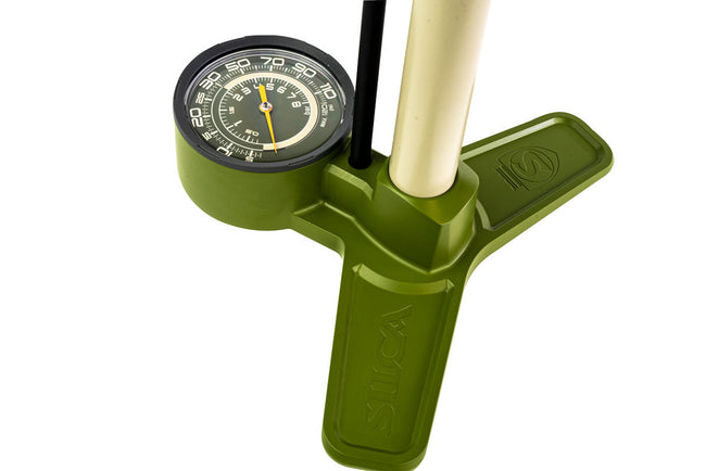 In 1988, SILCA noticed the growing MTB market in the US and began developing a high volume pump with low pressure gauge to meet the needs of this completely new category of bicycle. Named the Terra, it was the first of it’s kind, high volume, low pressure specific pump for larger volume tires. Now, 34 years later, SILCA reintroduces the Terra concept with new and exciting technology that allows it to be not only the world’s most refined low pressure pump, but also maintains high pressure capabilities, as well. Using a revolutionary new non-linear gauge scale technology, the Terra pump uses custom gauge internals which allows for 0.5 psi precision at the low end of the range climbing to 2 psi precision at the high end of the range (120psi). This unique design allows the gauge to achieve 120 psi overall capability; yet, 50% of the gauge face contains 0-30psi (0-2.1bar). Terra maintains SILCA’s famous all metal construction with lathe turned Ash wood handle; but, breaks the traditional SILCA mold with a unique lever operated chuck based on SILCA’s own award winning Tattico mini pump chuck design. This full metal chuck uses a threaded reversible end cap to switch between presta and schrader and contains an inline pressure bleed button.