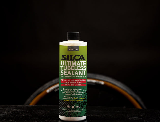 SILCA Ultimate Tubeless Sealant uses the power of a foaming latex formula combined with chopped carbon fibers to boost sealing power even at higher pressures. Ultimate Tubeless Sealant contains 5% by volume, 6, 9, and 12mm chopped carbon fibers which have been reclaimed from recycled bicycles, carbon wheels, racecars, and aircraft components. A unique foaming latex formula allows for the very lightweight carbon fibers to be evenly dispersed within the sealant while riding, which allows for a higher fiber content than possible with Kevlar or fiberglass. At this high fiber loading, bundles of carbon fiber are carried directly to the puncture by the sealant flow where thousands of micro-bubbles collapse on each other, depositing their high stiffness carbon fibers over the hole. During this process, the carbon fibers form a dam of fibers against the tire casing not unlike a beaver dam of sticks blocking the flow of a stream. This dam of high stiffness/high strength fibers has been shown to seal holes in testing up to 7.5mm, some 25% larger than conventional technologies.