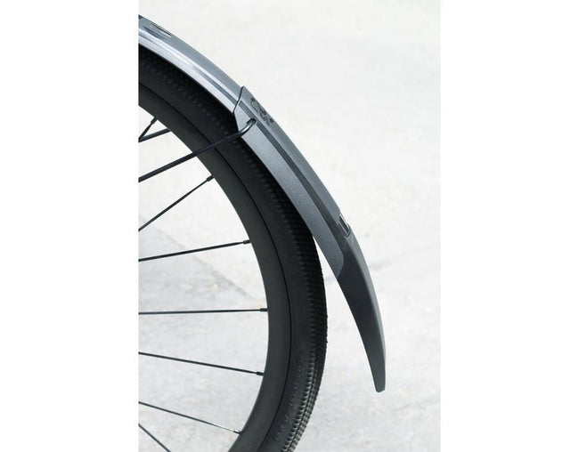 The SPEEDROCKER EXTENSION clip-on mudguard extension mainly protects riders behind you from dirt and wet conditions. The extension made of black, impact-resistant plastic can be easily clipped onto the tried and tested SPEEDROCKER rear mudguard, thus extending it by 170 mm. It can be mounted and removed without any tools in just a few seconds. The splashing between the tyre and mudguard at the lower end also allows it to better deflect any spray water and mud. This not only protects the rider’s back but also their cycling companion from any flying dirt.