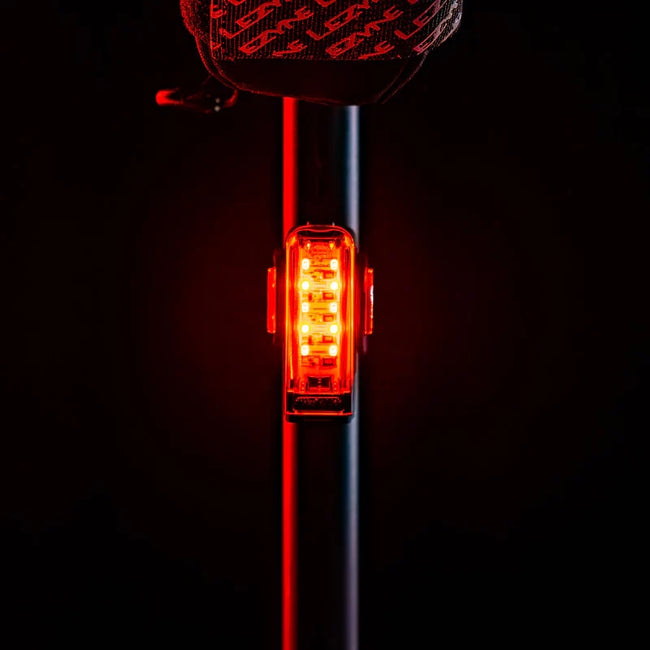 The Strip Pro Ai Alert 400+ Rear is a premium, highly visible rear taillight combined with advanced Ai Alert technology. Equipped with 10 super-bright LEDs providing a beam pattern optimal for light dispersion in even the most challenging conditions. The lightweight and durable co-molded construction with wide angle optics for 270° of visibility, offers 7 combined solid and flash output modes- from the highly disruptive max 400 lumens emitted in Day Flash mode to the impressive 80 hours of runtime in FEMTO mode. A versatile silicone rubber mounting strap attaches to aero or round seat posts. Rigorously tested to IPX7 Waterproofing standards to ensure functionality in the toughest weather conditions. The light also features a 1900 mAh battery capacity. With USB-C waterproof charging (cable not included).