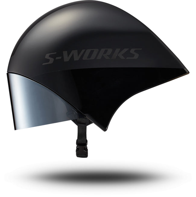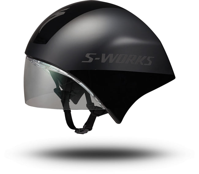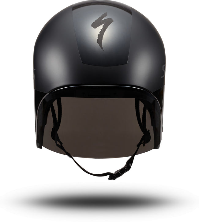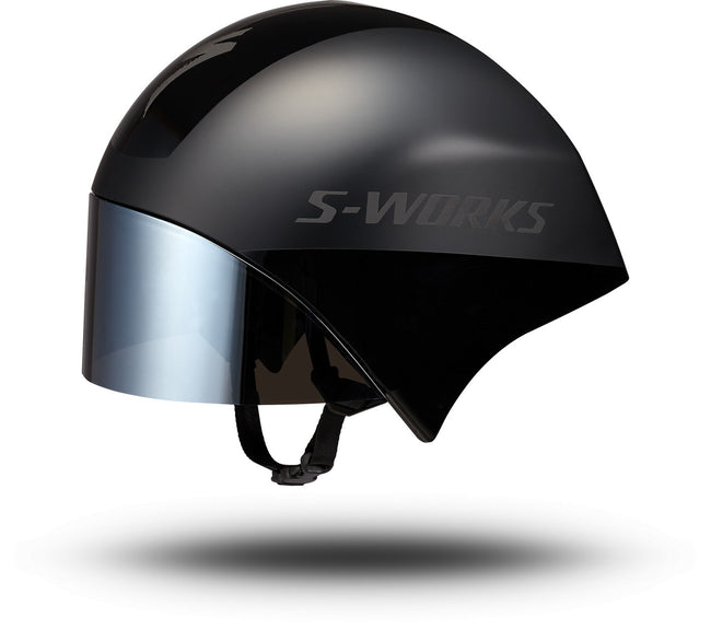 The S-Works TT 5 helmet comes equipped with a Class 1 optics shield for zero distortion when looking down the road, unlike traditional lenses that are typically drape-formed with clear plastic. The shield has a hydrophobic coating to help clear moisture away if the weather turns bad on race day, as well as a high-grade (EN166) anti-fog coating.